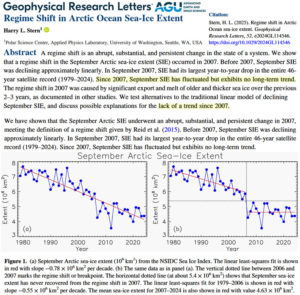 “Before 2007, September SIE was declining approximately linearly. In September 2007, SIE had its largest year‐to‐year drop in the entire 46‐year satellite record (1979–2024). Since 2007, September SIE has fluctuated but exhibits no long‐term trend.”